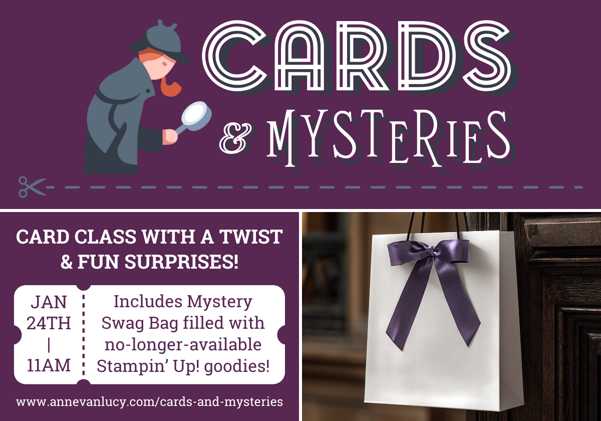 Every class attendee receives a MYSTERY SWAG BAG filled with no-longer-available Stampin' Up! goodies, and you can win additional surprises for solving the mysteries!
